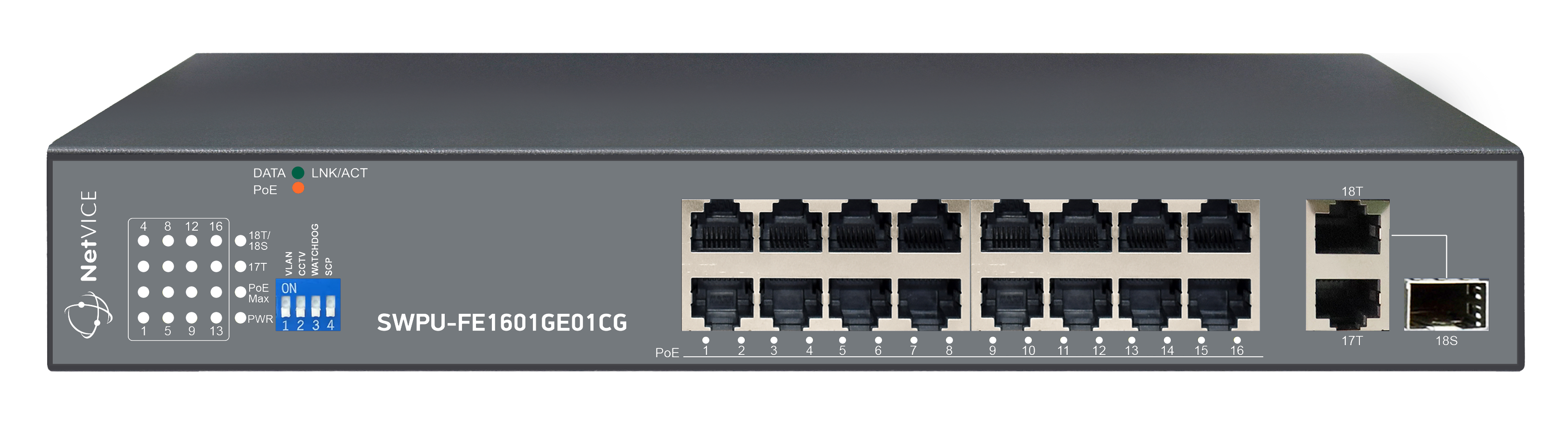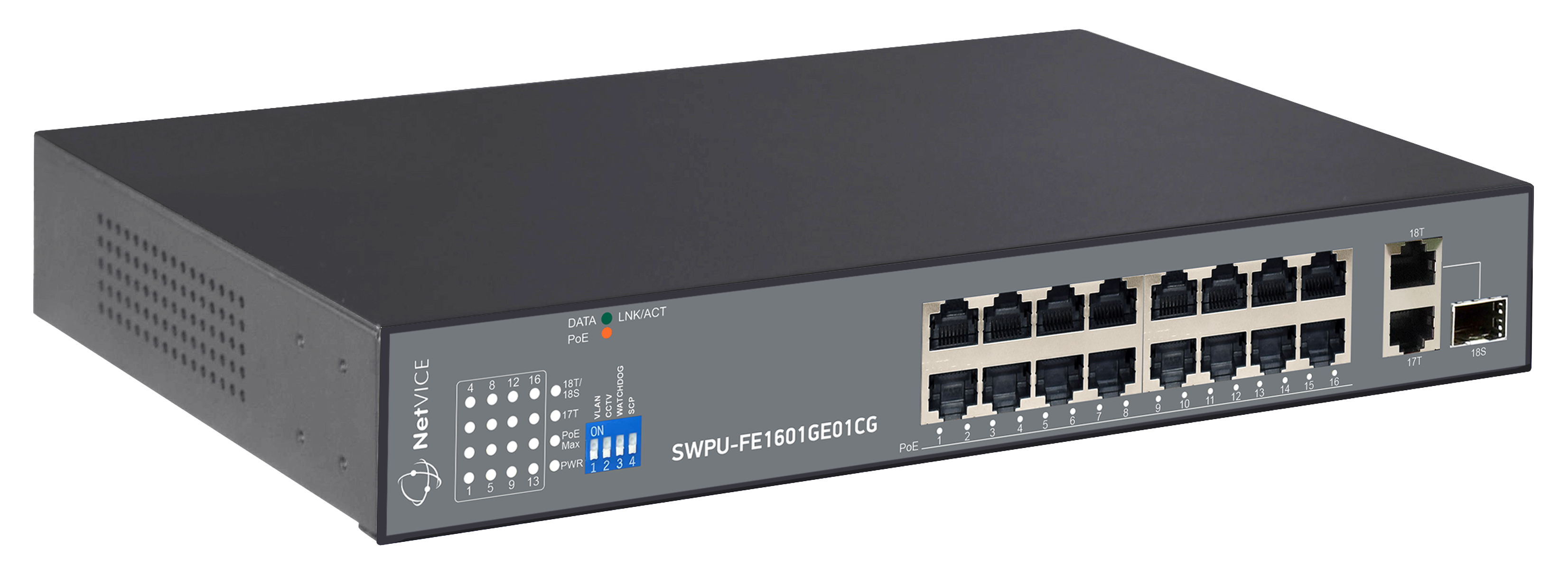 SWPU-FE1601GE01CG - неуправляемый сетевой коммутатор для коммерческого использования на 18 портов. Устройство адаптировано для устойчивой и надежной работы в российских условиях в составе системы видеонаблюдения. Модель оснащена 16 Fast Ethernet PoE портами с поддержкой стандарта IEEE802.3af/at, 1 Gigabit Ethernet Uplink портом и 1 Gigabit Combo Uplink портом. Бюджет PoE составляет 185 Вт, максимальная мощность на порт – до 30 Вт. Реализована поддержка Quality of Service (QoS) для стабильной передачи видеопотока и работы сети.